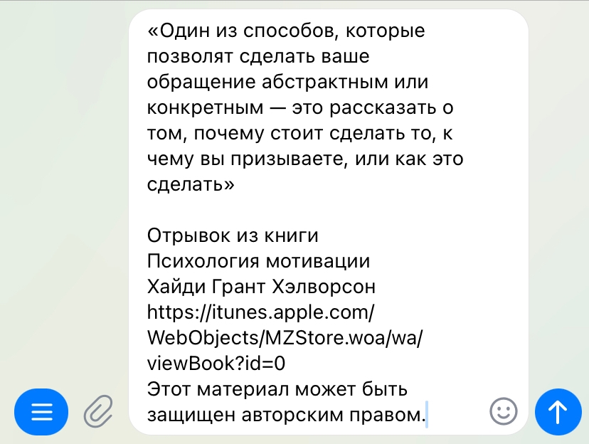 Поделитесь цитатой с ботом, он распознает книгу-источник, скопирует текст в приватную заметку и надежно сохранит в BOOKFIT. А в ответ на присланную цитату предложит сразу же с ней поработать.